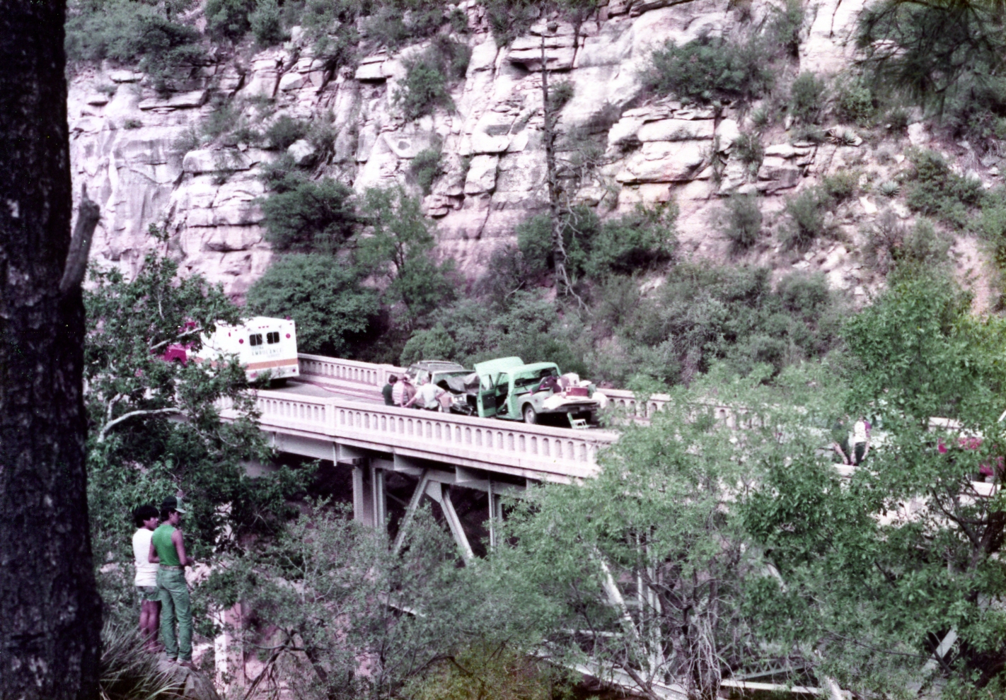 The patient came from this head on. Tpatient was riding in the bed of the pickup and was catapulted over the side of the bridge. Its 80 feet to the creek. The patient bounced through the branched of a tall tree (background) and was evacuated up from the creek to the LZ.